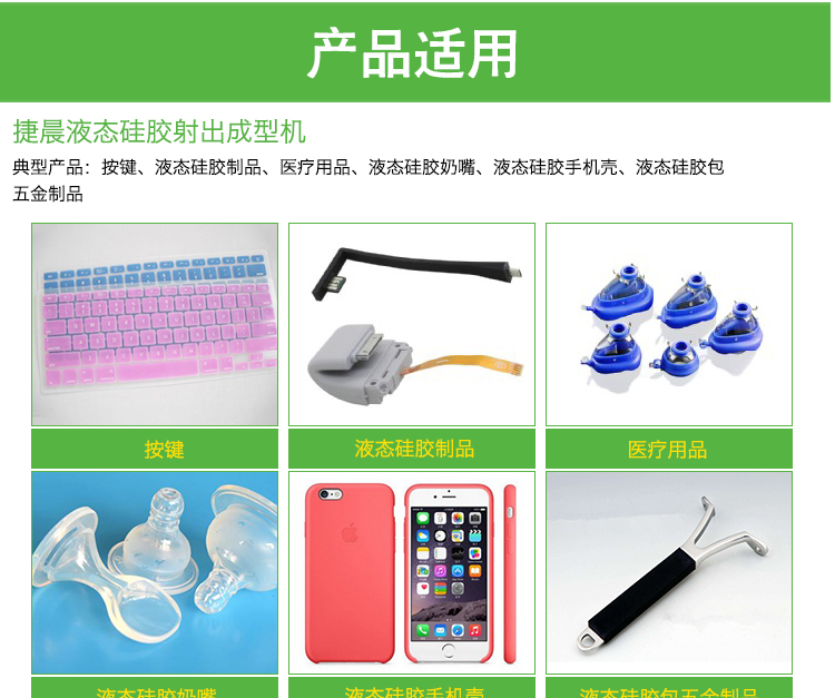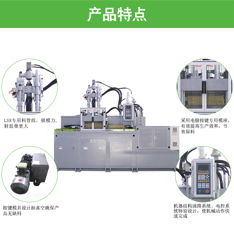200噸液態矽膠(jiāo)按鍵射出成型機,廣泛應(yīng)用於電子產品、各類按鍵、鍵盤保護膜、汽(qì)配用品等,特點(diǎn)包括:1、LSR專用(yòng)料管(guǎn)組,鎖模力、射膠量更大;2、機器結構油路係統、電控係統特別設計,使機(jī)械動作快速完成。